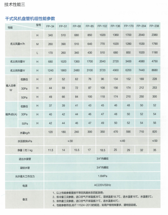 風機盤管機組主要由離心風機、盤管換熱器等構成,是中央空調系統的末端裝置,它廣泛應用于賓館、飯店、工廠、醫院、展覽館、商場以及辦公大樓等多房間或大空間工業和民用建筑的空調場合,以滿足降溫去濕、采暖等要求,為人們創造一個清新、寧靜、四季如春的工作和生活環境。 本公司風機盤管機組經過設計優化,盤管性能大幅提高,盤管機組分為高效型和標準型兩種;其中標準型風機盤管能滿足國標要求的各項參數,高效型風機盤管的性能參數優于國標要求20%以上。 FP-WA臥式暗裝風機盤管,此機組輪廓高度低,可理想的放入天花板內,結合室內裝修,配上出風口,是賓館、飯店、辦公室等理想的空調設備。 直流無刷風機盤管 使用直流無刷電機,實現高中低三檔調速以及無級調速的多樣化控制。 1、工作轉速范圍大,可滿足各種風量模式下的轉速要求。 2、隨著電機轉速降低,風量也隨之變化,這一變化降低了能耗,從而達到節能的效果。 水路控制系統 兩通或三通開/關型水路控制系統包括電動執行器,閥及其相關組件。該控制系統由工廠直接安裝在帶加長水盤的盤管機組上,通過控制冷水或熱水系統的開啟與關閉來實現室內溫度的自動調節。 1、安裝方便,現場只需連接水管及電源,即可投入使用。 2、設計緊湊,充分利用加長水盤空間,不需要改變機組尺寸。 FP-WA臥式暗裝風機盤管機組特點 1、安全可靠,壽命長 每臺盤管換熱器都經過壓力檢漏;進出水接管(集水頭采用鍛黃銅結構,可靠耐用);凝水盤噴塑處理,不生銹,全部材料系仿活型;電動機采用超低噪聲滾動軸承,無需用戶加油維修,使用壽命可達35000小時;電動機細長軸徑特殊處理無銹蝕。 2、效率高,能量組 風機盤管采用無縫紫銅管串套搞笑的雙翻邊鋁肋片并肋緊成一體,傳熱效率高,冷(熱)量富足,標準型盤管能滿足國標要求性能,高效型盤管性能達到了國際領先水平。 3、風量大,噪音低 風機盤管采用超廣角蝸殼,鋼板制多葉離心風輪,風輪與電動機可有多種優先匹配,以滿足風機盤管機組各個規格的需要。 4、選用靈活 考慮安裝工地各有其特殊性及場地限制等原因,本公司提供不同長度水盤供客戶選擇。 1、標準水盤——使所需安裝位置縮小,特別適用于安裝空間狹小的場所。 2、加長水盤——能更好的接住閥門漏水和凝結水。 風機盤管安裝、使用說明 1、風機盤管安裝在水平面上,保持垂直,不得傾斜;臥式機組,安裝時四個吊點一定要保持機組水平,防止凝結水管一端抬高造成凝結水外溢。 2、進出水管路應裝有閥門,以便于調節和檢修,并且必須注意進出水管的清潔和保溫工作,凝結水塑料管不得壓偏,不得有死彎,以保證使用時凝結水暢通。 3、機組三檔調速開關,開啟時應從高檔啟動,然后進行其他檔次的選擇,多機共用時,必須單機控制。 4、機組用電源:單相220v±10%,50Hz交流電機殼應安裝接地線,若機組啟動有困難,務必注意檢查電源是否正常,風輪與風機蝸殼是否接觸,機組安裝時必須注意外殼,換熱器肋片和風機等不要碰壞以免影響美觀和性能。 5、機組夏季供冷水溫度不得低于7℃,冬季供熱水溫度不得高于80℃,使用冷、熱水必須考慮個地方水質情況進行軟化處理。 6、機組允許使用壓力最大1.6MPa。 7、過濾器要進行定期清洗,保持清潔,確保傳熱良好。 8、接通電源后應先開動風機觀察其旋轉方向是否正確。 9、機組如果裝在暗處,要設有檢修門,便于常年維護。 10、機組在維修時應切斷電源。 11、卡式風機盤管安裝、使用詳見隨機說明書。 12、隨著我廠技術水平的不斷提高,對產品規格本廠有權更改,若機組的性能參數更改,以隨機的技術文件為準,不另行通知。 訂貨指南 1、選用風機盤管機組,請明確產品的規格型號及其進出水的左右式。 2、臥式暗裝風機盤管機組選配回風箱時,請注明回風方式是下回風還是后回風。 3、臥式暗裝風機盤管機組分低靜壓(12Pa)和高靜壓(30Pa、50Pa)三種,請在訂貨時注明。如無特殊要求,則按低靜壓型供貨。