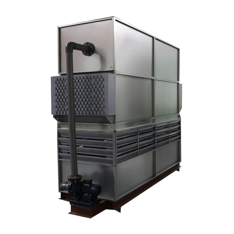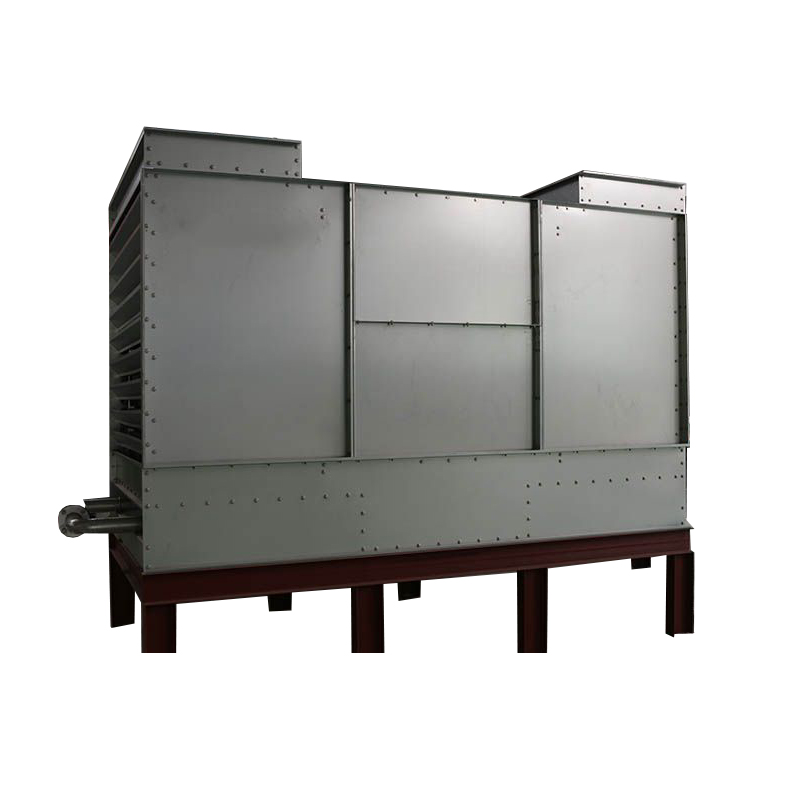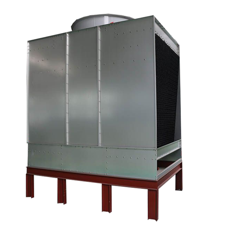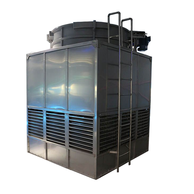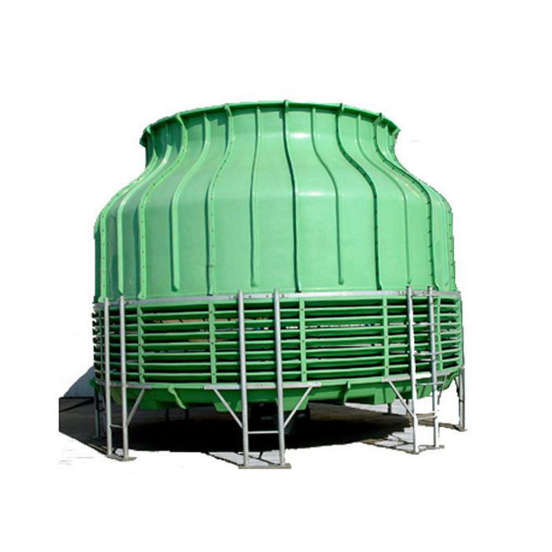方形橫流式玻璃鋼冷卻塔采用兩側(cè)進(jìn)風(fēng),靠頂部的風(fēng)機,使空氣經(jīng)由塔兩側(cè)的填料,與熱水進(jìn)行介質(zhì)交換,濕熱空氣再排向塔外。填料采用兩面有凸點的點波片,通過安裝頭使點波片粘結(jié)成整體,以提高剛性,兩面的凸點還可避免直接滴水,因此提高了水膜形成能力,填料尾部設(shè)有收水措施。