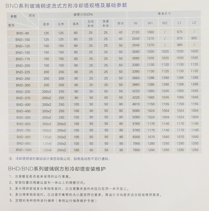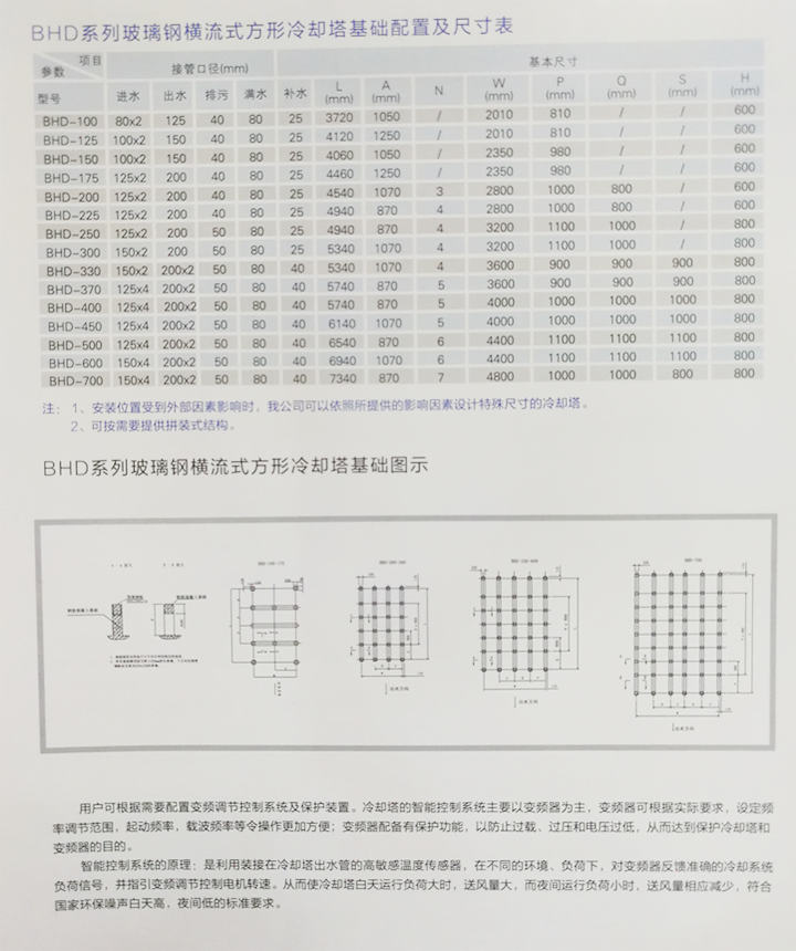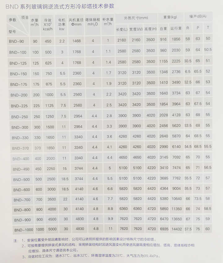 方形逆流玻璃鋼冷卻塔產(chǎn)品概述 機械工業(yè)部第四設(shè)計研究院設(shè)計的節(jié)能型逆流式玻璃鋼冷卻塔,是在原設(shè)計的同類塔測試數(shù)據(jù)基礎(chǔ)上改進(jìn)設(shè)計的。本設(shè)計應(yīng)用了四院獲得的“節(jié)能型玻璃鋼冷卻塔”專利(專利號:88215994.1)。該專利特點是冷卻塔風(fēng)機配有變扭矩變極雙速電機,當(dāng)氣溫較低時,例如晚上,電機開低速,冷卻塔噪聲可低3-5dBA。此外,用雙速電機節(jié)電顯著,多臺冷卻塔配單速電機時,為了節(jié)電當(dāng)空氣溫球溫度低時,可停部分電機。仍比用雙速電機以年計多耗電40%。 雙速電機的控制柜可配套供應(yīng),也可只提供控制柜的圖紙。控制柜的價款不包括冷卻塔價款之內(nèi),須另計。 本設(shè)計還應(yīng)用了四院獲得的國家專利“方形逆流式冷卻塔用斜梯形波填料片”(專利號:91216967.2)。經(jīng)北京水科院和佛山實塔測試,其熱力、阻力特性均優(yōu)于其它填料。 設(shè)計參數(shù):工業(yè)塔為:空氣濕球濕度τ=28℃,進(jìn)塔水溫t1=42℃,出塔水溫t2=32℃;民用塔(低溫降):τ=28℃,t1=37℃,t2=32℃ 方形逆流冷卻塔 意義如下: 以水濕降分: ①低溫降,設(shè)計水溫度5℃(低噪聲的代碼前以D表示,超低噪聲的以CD表示); ②中、高溫降,水溫降10-25℃,代碼前以G表示。 以冷卻塔組部分:①無水盤的(代碼最后以L表示); ②淺水盤的(代碼最后以DP表示); ③深水盤的(代碼最后以GP表示),深水盤的有效存水深度400mm,如要求加大水深,訂貨時須提出。 代碼中FN表示鋼結(jié)構(gòu)方形的逆流式。 代碼中的數(shù)字表示冷卻塔的規(guī)格,也即設(shè)計工況下單臺冷卻水量,單位m3/h(立面及基礎(chǔ)圖所示為二臺塔,實用可單排多臺,或雙排多臺)。 方形逆流冷卻塔主要參數(shù)