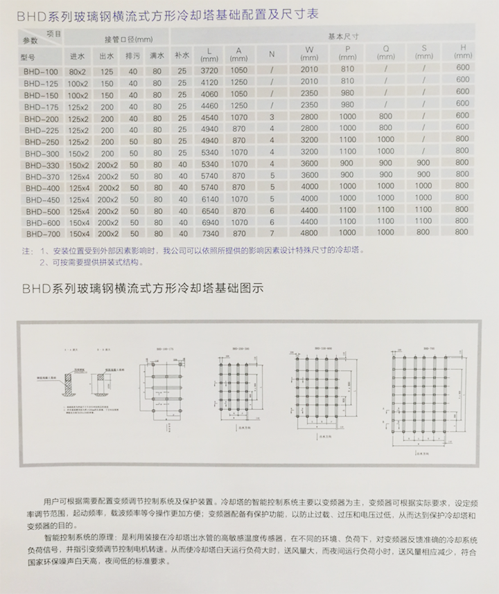 方形橫流式玻璃鋼冷卻塔概述 方形橫流式玻璃鋼冷卻塔采用兩側進風,靠頂部的風機,使空氣經由塔兩側的填料,與熱水進行介質交換,濕熱空氣再排向塔外。填料采用兩面有凸點的點波片,通過安裝頭使點波片粘結成整體,以提高剛性,兩面的凸點還可避免直接滴水,因此提高了水膜形成能力,填料尾部設有收水措施。 產品特長: 1、節省空間,結構輕型化 采用專為本系列冷卻塔設計的高效熱交換填料,其換熱面積大幅度提高,與原HBLD系列及原HBLCD系列相比,其占地面積大幅度下降,由于結構設計的優化及采用鋼結構,運轉重量也大大降低。 2、節省電力 采用通風阻力小的填料和由清華大學專為冷卻塔設計的機翼型玻璃鋼高效風機,從而減小所配用的電機功率,超低噪聲型采用的電機功率更小,更節省電力,也可根據用戶的要求,配用雙速電機來節電。 3、運轉噪聲極低 采用清華大學專為冷卻塔而設計的FRP材質的機翼低噪聲軸流式風機和專為冷卻塔而設計的低噪聲電機,從而降低了冷卻塔的運轉噪聲。超低噪聲系列冷卻塔的運轉噪聲更低,全面符合環保要求。若配用雙速電機,在夜間低速運行時,還能使噪聲再下降2-3dB(A),用戶需要雙速電機應在訂貨時單獨提出要求。 4、良好的耐腐蝕性 塔體、水槽及面板均采用具有良好耐腐蝕性能的FRP材質,并在膠衣樹脂中加有光穩定劑,具有良好的抗老化性能,經久不變色。塔體鋼結構件在加工后采用鍍鋅處理,提高冷卻塔的耐腐蝕性能,在正常使用壽命內,不需另外防腐。 5、組合方便 可采用組合方式來滿足不同工況的要求,用戶也可根據場地情況進行決定組合,并可根據用戶的建筑物特點,調整冷卻塔的外觀。如用戶場地十分有限。我公司也可針對用戶的特殊要求進行設計,滿足用戶對熱力性能及噪聲的要求。 6、維護方便 本系列冷卻塔為組合式設計,相鄰冷卻塔空氣室相互隔開,可在冷卻塔正常運轉的前提下,進行維護檢修,清洗填料、積水管和水箱的工作更加方便。 產品結構: (1)面板:玻璃鋼材質,表面光潔美觀,耐腐蝕,防老化。 (2)填料:為改性聚氯乙烯雙向點波片,熱力性能好,氣流阻力小,剛性好,耐熱75℃、耐寒、阻燃。 (3)風機:葉片材質為合金鋁板。風機氣動力合理、風量大、效率高、噪聲低、耐腐蝕等特點。 (4)電機和減速機:為外協設備。 (5)布水槽:玻璃鋼材質,配水均勻,超低噪聲型有蓋板可蔽光,防雜物飛入,減少濺水聲。 (6)消聲罩:玻璃鋼材質,內粘空腔式阻燃型聚氯乙烯薄膜消聲材料。 (7)百葉窗:玻璃鋼材質,可防水濺出,并可使進塔氣流均勻。 (8)水箱:玻璃鋼材質,起集水作用,設有自動補充水設施,可閉路循環直接吸水。 (9)骨架:為折邊型鋼組裝結構,剛性好,重量輕,運輸、安裝方便,熱鍍鋅防腐。 性能與選擇 1、設計參數: 1)標準工況:進水溫度t1=37℃,出水溫度t2=32℃,設計濕球溫度τ=28℃,即水溫度Δt=5℃,冷幅高t2-τ=5℃ 2)中溫工況:進水溫度t1=43℃,出水溫度t2=33℃,設計濕球溫度τ=28℃,即水溫度Δt=10℃,冷幅高t2-τ=6℃ 3)高溫工況:進水溫度t1=60℃,出水溫度t2=35℃,設計濕球溫度τ=28℃,即水溫度Δt=25℃,冷幅高t2-τ=8℃ 2、選用時須知水量Q,進水溫度t1,出水溫度t2及設計濕球溫度τ,然后再根據熱力性能求出。對曲線表以外的工況,可以進行熱力計算,其填料的容積散質系數β×ν如下: 1.2倍名義流量時:β×ν=18600 1.0倍名義流量時:β×ν=17800 0.8倍名義流量時:β×ν=17000 3、運轉重量按下塔體存水一半深計算,如果裝滿水計算應乘以1.5。 4、本系列冷卻塔用于最冷月平均氣溫不低于-10℃的地區,氣溫過低時使用,應考慮管路及水槽的結冰問題,特別是在冬季間斷運行過程中,水泵直接由塔的水槽內的循環系統,更應考慮,避免結冰的問題,必要時需在槽內加電熱管。 5、適用水溫不超過65℃,如超過65℃時,訂貨時應提出水溫要求,以便選材時考慮,如有阻燃或難燃要求的,應根據當地消防部門對玻璃鋼氧指數的要求進行生產,應該由用戶事前提出。對安裝在屋頂上的橫流塔建議用戶選用阻燃性玻璃鋼。我廠生產的阻燃,難燃型玻璃鋼材質、其氧指數分別達到≥31或≥35。 6、循環水渾濁度不大于50毫升/升,短期內不大于100毫升/升,不宜含油污和機械型雜質,必要時采取滅藻及水質穩定措施。 7、配水箱的配水孔按名義流量開孔,如實際流量超過名義流量25%,應在訂貨時予以說明。 8、進水管水壓大約為2-5米汞柱,設計時不要壓力過高,否則會產生飄水現象。 9、電機、風機均配套供應。需本廠派員現場安裝或技術指導,另加收費用。 10、排污管、溢水管、自動給水管、急速給水管根據用戶要求選用。 型號規格 橫流式玻璃鋼冷卻塔型號代碼及意義: B-玻璃鋼 H-橫流塔 Z-組裝式 L-冷卻塔 D-低噪聲型 CD-超低噪聲型 G-中高水溫降工業型 安裝使用注意事項 1、應放置在通風良好潔凈的場所。 2、橫流式塔進水管由兩邊分別裝設,并連接到配水箱,用戶應在接管處設置蝶閥,以供調節流量。進水管可以由下面的干管引入,也可以把干管放在塔上,這時其管道支架應落在冷卻塔側面的架上。出水管可選任一進風方向由塔底水箱接出。 3、安全及使用時應調整風筒的圓度,并使葉尖與塔壁間隙相等,并不少于10mm。葉片角度要調整到一致。調整葉片的方法為在靠近葉尖150mm處,對每根葉片的前后兩緣分別做一標志,再由支架下弦分別測每根葉片前后兩緣的距離,以計算出各葉