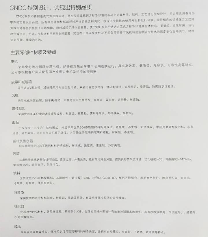 1、優(yōu)質(zhì)304不銹鋼材料折彎成型、可重復(fù)再生利用; 2、護(hù)板采用304不銹鋼復(fù)合結(jié)構(gòu),結(jié)構(gòu)輕巧,隔熱吸震效果優(yōu)良; 3、生產(chǎn)過程中不會產(chǎn)生對環(huán)境、人體的損害,是當(dāng)今冷卻塔行業(yè)的環(huán)保先鋒; 4、填料插入到水面,避免了由于水落差而產(chǎn)生的噪聲; 5、使用大風(fēng)機(jī),低轉(zhuǎn)速運行,大風(fēng)量,低能耗; 6、采用填料自帶收水特殊結(jié)構(gòu),優(yōu)質(zhì)改性PVC專用收水裝置; 7、模塊設(shè)計、特別適合多臺塔接在一起,占地面積小、美觀大方; 8、單模塊處理水量:100~600m3/h;模塊之間自由組合; 9、廣泛應(yīng)用于中央空調(diào)系統(tǒng)工程;