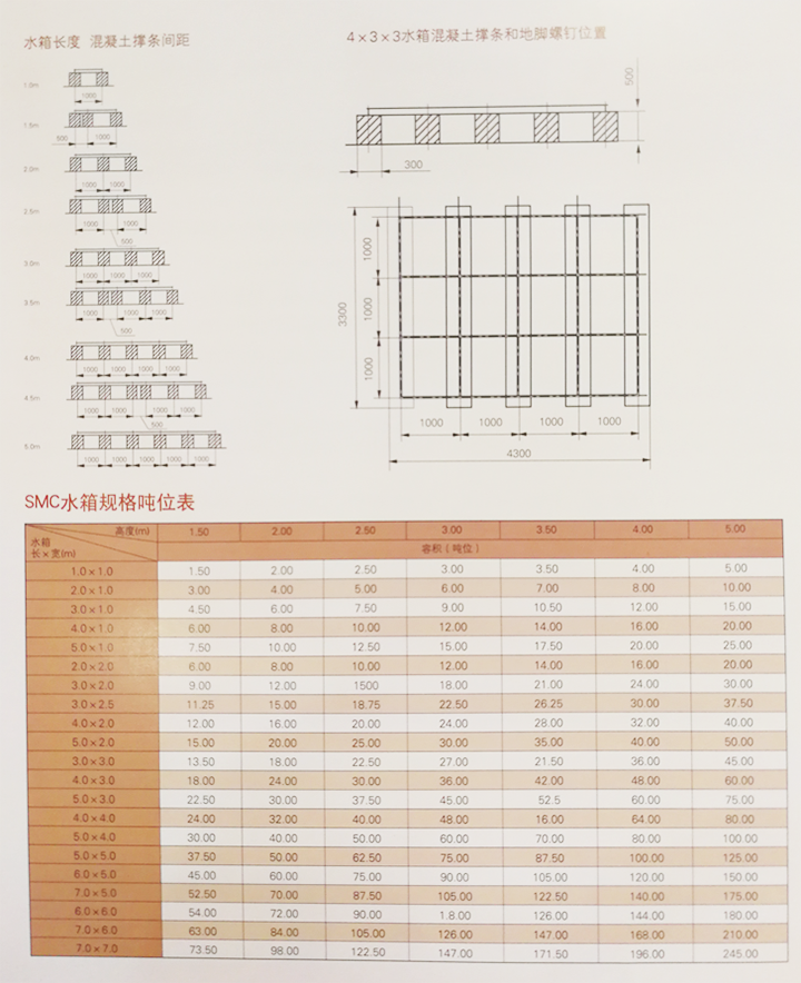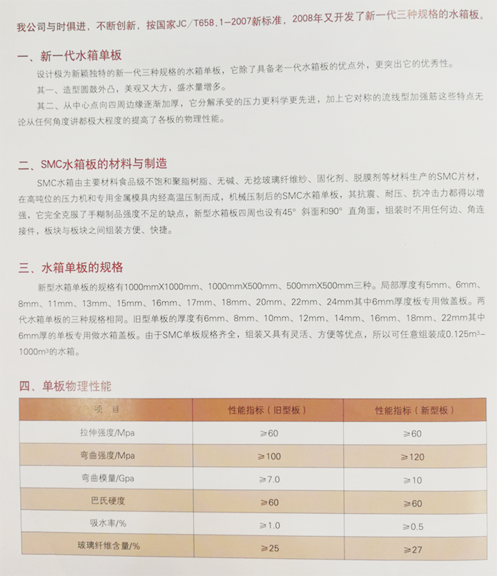 SMC玻璃鋼水箱特點 SMC組合式玻璃鋼水箱是目前國際上采用的新型水箱。其特點是采用食品級樹脂,因此水質好,清潔無污染;具有強度高,重量輕,耐腐蝕,外型美觀,使用壽命長,保養(yǎng)管理方便等特點。 SMC組合式玻璃鋼水箱是由SMC模壓板塊、密封材料、金屬結構件及配管系統(tǒng)現場組裝而成。給設計和施工帶來極大方便。一般水箱按標準設計,特殊水箱需要專門設計??筛鶕脩粜枰M裝0.125-1500m3的水箱。若原有水箱需要更換,不需要改造房屋,適應性很強。專門研制的定型產品密封帶,該密封帶無毒、耐水、彈性大、永久變型小,緊固密封。水箱整體強度高,無滲漏,無變形,保養(yǎng)、檢修方便。 SMC模壓單板性能及規(guī)格 SMC水箱是采用食品級樹脂生產的SMC片材,經高溫、高壓、機械壓制而成。 在制造工藝上,采取機壓成型的制作方法。增加了抗震、抗沖擊的強度,克服了手糊制品強度不均勻的缺陷,提高了耐壓強度和使用壽命 在外型設計上,板塊中部呈凹陷弧度,提高了水箱的承壓能力,同時板塊四周設有45°和90°的凸緣,組裝時不用邊角連接件,更具有柔韌性和靈活性,水箱板塊規(guī)格有:1000×1000mm;1000x500mm;500×500mm。厚度有4mm,6mm,8mm,10mm,12mm,14mm,16mm,18mm,20mm其中4mm厚度板材專用做水箱蓋板。因而可任意拼裝成所需容量的水箱。 SMC玻璃鋼水箱用途 廣泛適用于工礦、企事業(yè)單位、住宅、賓館、飯店等建筑,作為生活飲用水、中水處理、消防用水及其他用水儲水設施。